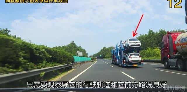 我现在打算超它的话,就要注意它会不会向左变道占用最左侧车道超车。仍然是打左转灯、闪灯、提速超车,在接近它的车尾时再次鸣笛提醒。那是不是每次都要这么繁琐呢?只要超大货车都是要这样做吗?也不尽然,主要取决于你对它的观察和判断。比如说我现在超这辆车辆运输车就不需要这么繁琐,只需要观察好它的行驶轨迹和它前方路况良好。