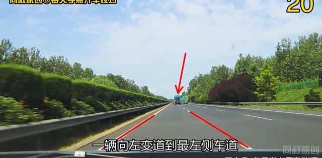 像这种突然从右侧车道向左拐出来的车辆尤其要注意的它动态,要在它车后左车道放慢点速度,观察它稳定下来后再提速超车。像前面这几辆大货车,一辆向左变道到最左侧车道,一辆紧跟着打左转灯向左变道。