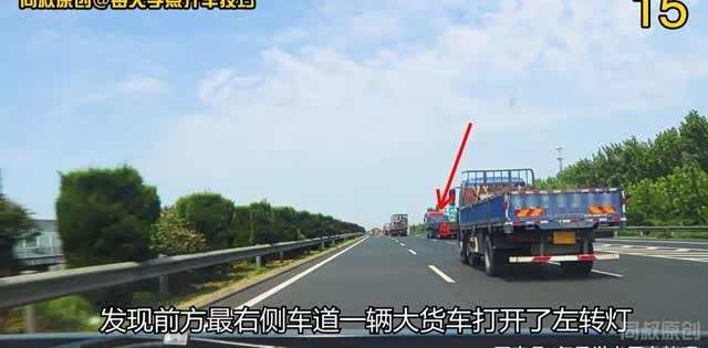 就在我即将超车的时候,发现前方最右侧车道一辆大货车打开了左转灯。