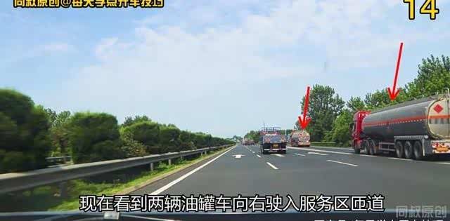 根据右侧前方到达服务区标牌判断,该震荡线是为了提示前方有服务区,提醒你注意右转进入服务区的车辆,不要在右转出口与右转车辆产生交集。还有就是提醒长途驾驶的司机,即将到达服务区注意提前准备进站休息。现在看到两辆油罐车向右驶入服务区匝道,但是前方道路上仍然有不少大货车在继续占用两个车道行驶中。