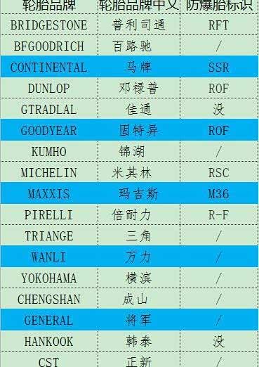 部分高级轮胎,在缺气的情况下,也不会酿成更大的安全事故,这类轮胎往往会在胎体上标注“防爆胎”标示,以与普通系列轮胎区隔开来。不过不同品牌的轮胎,其“防爆胎”标示不一样,详见下表: