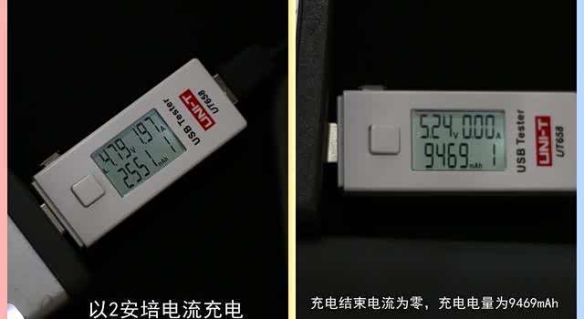 现在是充电测试,以2A充电,大约5小时后充电结束,共计充入9469mAh电量,除去损耗外,标称11100mAh的容量,这个效率是很惊人的了。