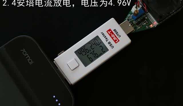 现在我们来进行放电能力测试,测试USB接口的放电能力,从侧面可以反映电芯性能。我们使用可调式电子负载和USB接口测试仪,根据产品特性,调整电子负载,使输出电流为2.4安培,这时候,电压输出为4.96V,说明电源余量充足,如果电源余量不充足,电压会跌落很多。