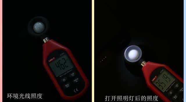 现在测试的是LED照明灯的照度,环境光线是462LUX,开启照明灯,距离照度仪大约6厘米处,照度为3519LUX,在车载使用环境下,例如黑夜中在后备箱找物品、在引擎仓中查看物品,这些环境下这个亮度足够,并且,通过按动电源开关,照明灯还具有SOS和爆闪模式,SOS是以莫尔斯编码规则发出SOS信号的闪烁,在黑夜中能够引起别人的注意,在满电状态下,支持LED工作48小时。