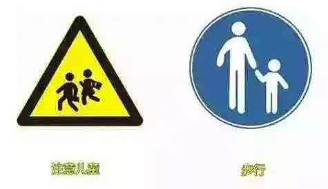 分辨方法:颜色不同,黄色三角表示“注意”,蓝色圆形常用语提示行事规则。