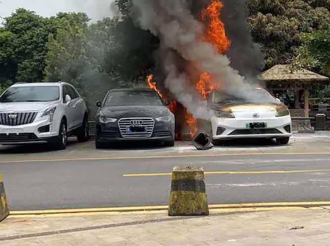 从网络上曝出的相关视频来看,这辆车处于正常停放且在未充电的情况下发生自燃,现场火势较为猛烈,产生大量浓烟,车辆尾部有可见的明火不断冒出。在这辆AionS旁边还停放着一辆奥迪汽车,在AionS发生自燃后,这辆奥迪也受到牵连,车辆前挡风玻璃明显损毁。