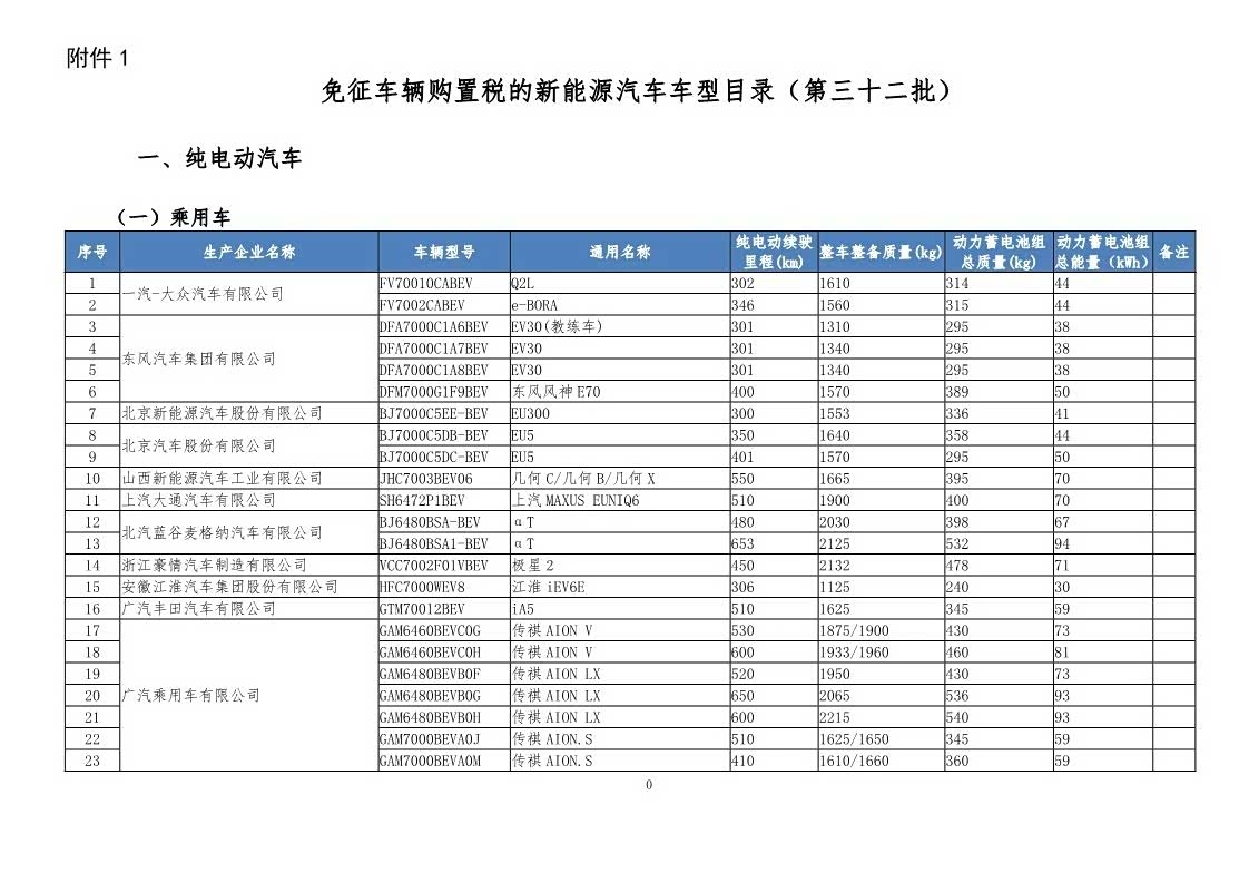 免征车辆购置税的新能源汽车车型目录以及见下图: