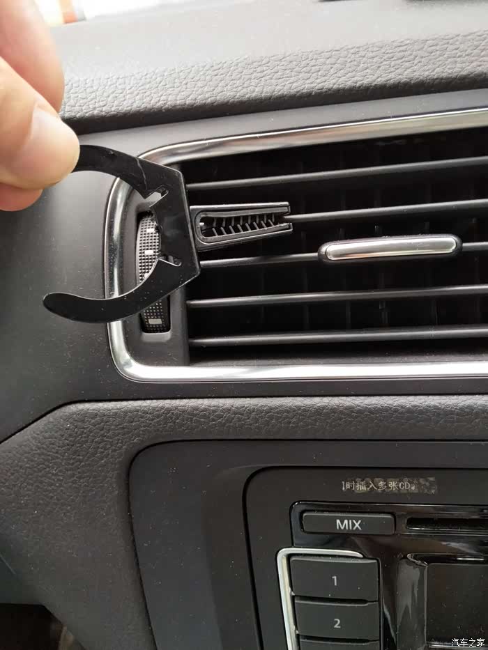 先把卡子插到出风口上。背夹有橡胶层,避免夹伤出风口塑料片。