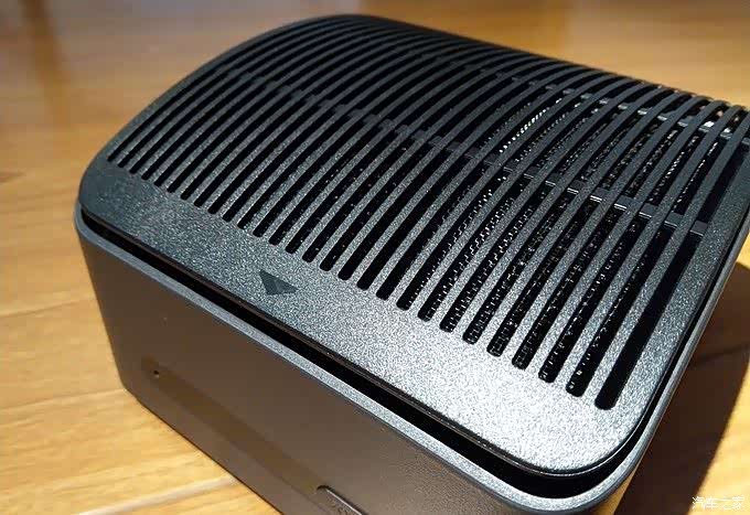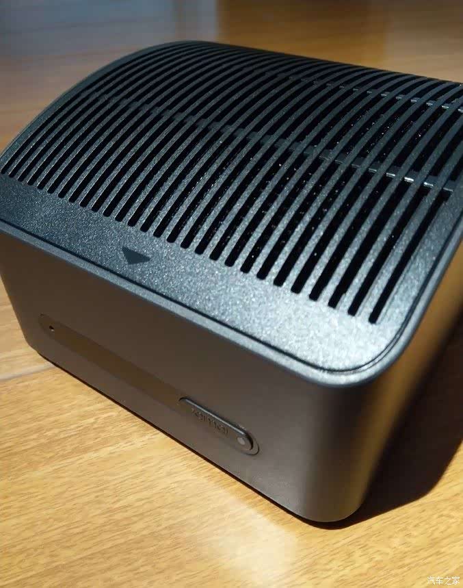 设计非常简洁,上面是进风口。有个三角标记处按下,上盖会弹起。弹起设计也是比较方便的,目前在家使用的几款净化器都是靠手硬掰的。正面是粉尘感应器和按键,这按键同时兼具指示灯功能。背面是出风口,净化过的空气就从这里排出。