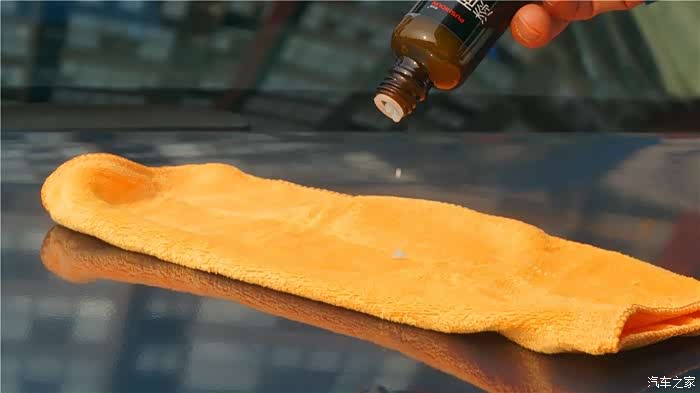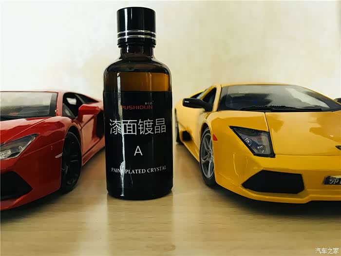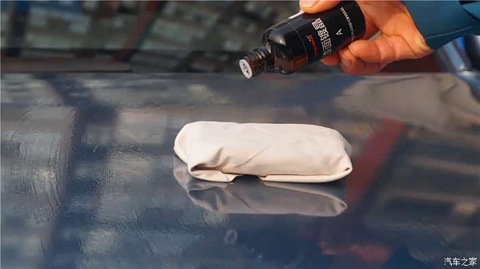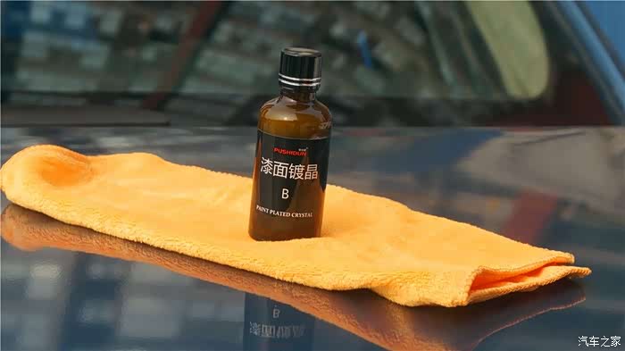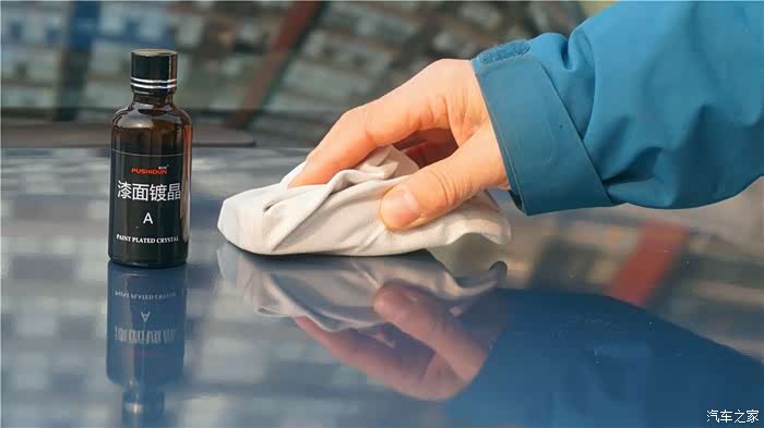 镀晶B液采用的是硅素聚合物、氟素聚合物和高纯水等环保材料精制而成,主要是配合A液使用,加快结晶速度并提高整体顺滑性。车漆上涂抹镀晶A液一小时后,将镀晶B液倒在纤维毛巾上均匀涂覆漆面,保持3-5分钟后擦亮即可,与A 液一样需要分区域重复涂抹完成全车擦拭。
