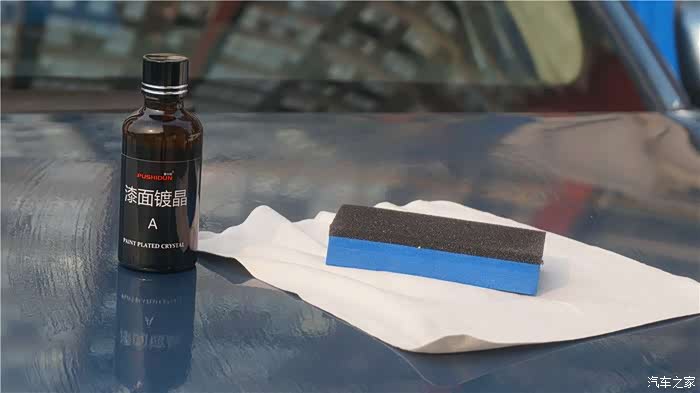 漆面镀晶主要作用是防水抗污、抵御酸碱侵蚀、抗划痕等,分两个步骤使用A、B液分别完成。镀晶A液由二氧化硅石英晶体与功能性高分子材料复合而成,能在车漆表面形成晶莹透明的结晶层。具体操作为滴几滴镀晶A液到眼镜布包裹的海绵上,均匀涂抹在车漆上,3-5分钟后擦亮即可。为了防止镀晶液快速挥发或者结晶,一次涂抹面积不要太大,大约五滴A液涂抹40*40cm左右面积就行,要分区域重复涂抹全车擦拭。