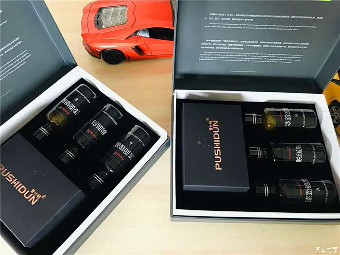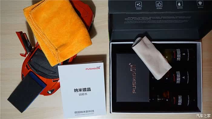 打开包装,镀晶产品包含脱脂剂、镀晶A液和B液三部分,分别装在三个 50ml 的玻璃小瓶内,镶嵌在由软质泡沫依产品外形而切割的几个分格内,分格正好起到固定和保护产品的作用。包装内有一份图文并茂的说明书,还有随产品包装附赠的海绵、眼镜布、微纤维毛巾等配件,方便施工时配套使用。