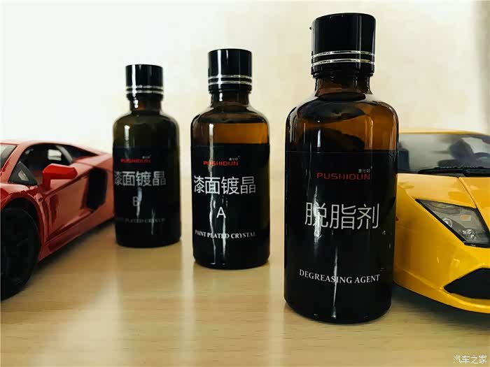 镀晶产品毕竟是化学品合成,打开瓶盖闻一闻,脱脂剂和镀晶A液都有一股淡淡的化学品呛鼻的味道,镀晶B液要好许多。在给汽车镀晶的过程中,我一直都是直接用手接触并完成擦拭,手上显得干而涩,失去了往日的光滑与滋润,说明产品对皮肤有轻微的腐蚀性,所以建议在对车漆涂擦操作时,最好戴上口罩和薄的橡胶手套,避免长时间接触对身体造成不必要的伤害。在此建议生产厂家在包装内直接配备口罩和手套