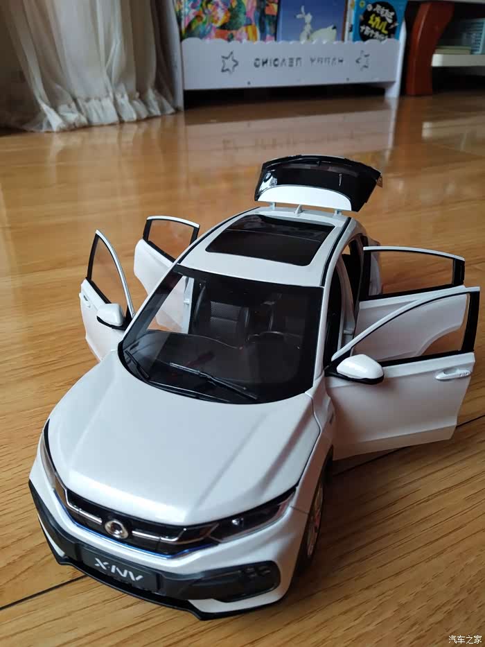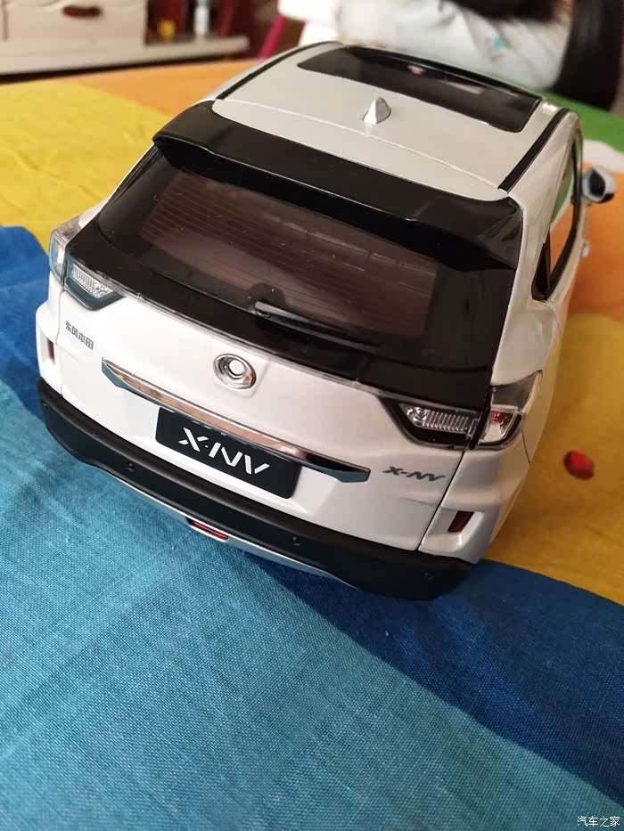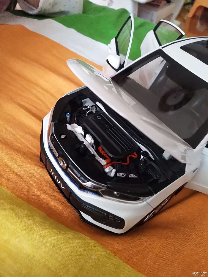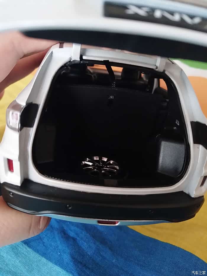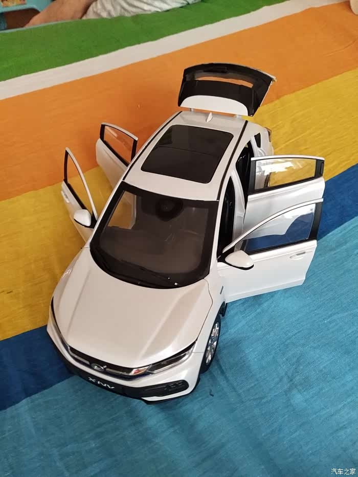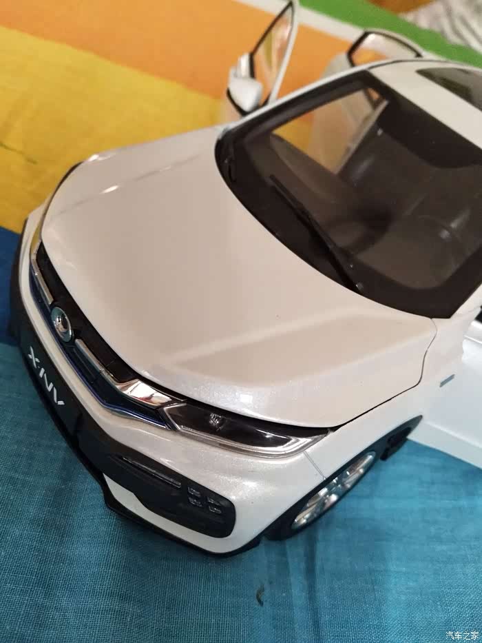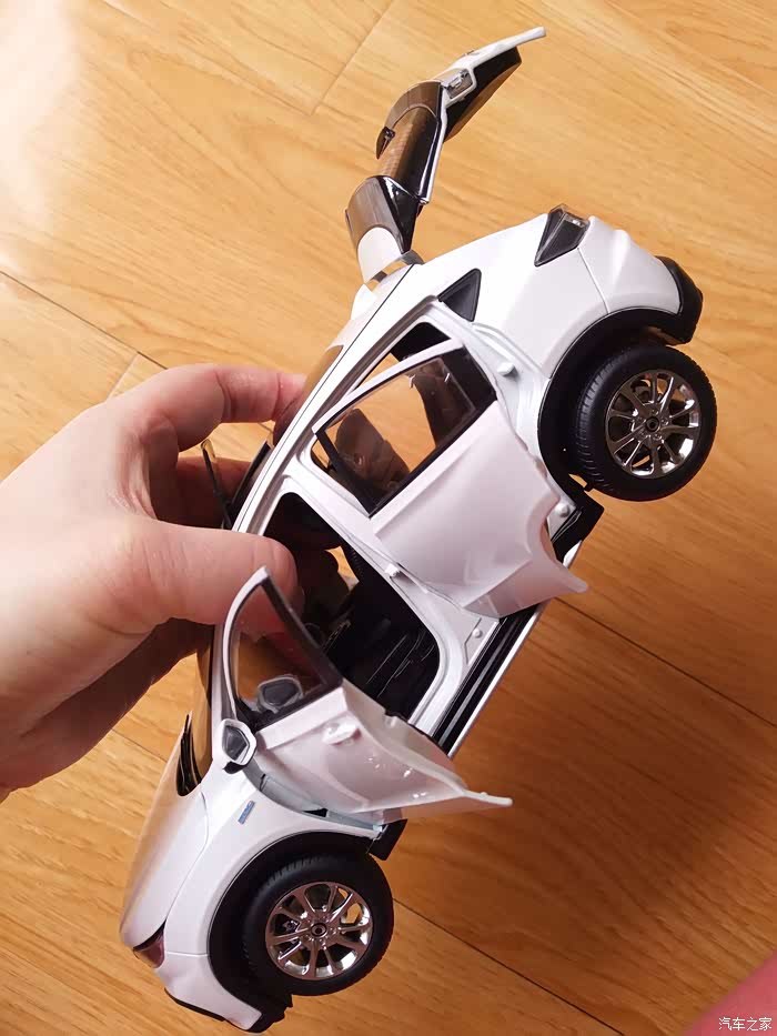 X-NV是基于东风本田XR-V打造而来,这款车模车头悬挂的是东风本田新能源车标,外观原创性较高,前脸造型略微夸张。前格栅两侧依旧是熟悉的开眼角灯,不过可惜的是高配也没有搭载LED全灯组。大灯组下方的包围两侧,采用了四点式转向灯、非常具有辨识度,侧面上看,本田X-NV车顶以及ABC柱都采用了黑色处理,跟白色车身形成鲜明的对比,视觉冲击力非常强,营造出一种独有的科技感和未来感。新车还搭载了双色花瓣形状的轮毂,设计显得调皮灵动,更为运动化。本田X-NV车尾采用贯穿式尾灯造型设计,采用这样的直通式尾灯是新车的一大亮点,具有强烈的识别能力,下方的黑色环绕也突出了了X-NV的运动性这款车模质量不错,细节做得很完善,分量也很重,金属质感很逼真。俗话说“麻雀虽小五脏俱全”,这 是一台结构相对简单的汽车,但越是“简单”在将其模型化时越复杂。如果模型在还原实车极度复杂的内构时可以选择模糊或者忽略,那么机械结构相对没那么“高级”的汽车反而需要更细致的模具设计。