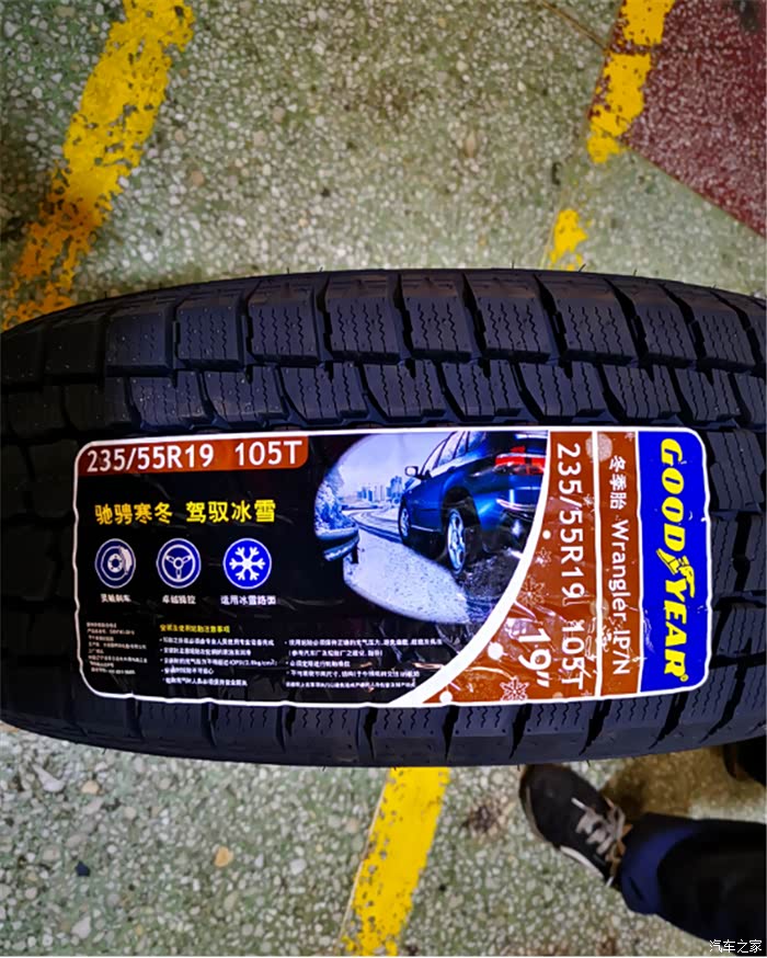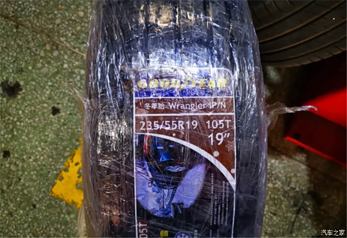 随后呢就是为车子安装新胎了,把我的固特异牧马人IP/N冬季胎外面包裹的塑料薄膜撕了。