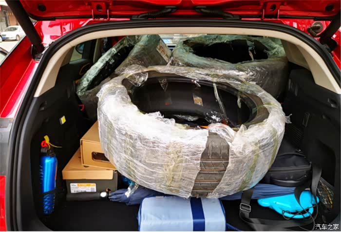 把车子上所有的轮胎都卸下来,包好了放到车子的后备箱里去,还别说我家VV7的空间还是蛮大的,在车子后备箱原本快满的情况下还能放得下四个十九寸的轮胎。