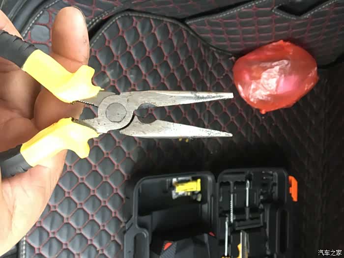 一把十字螺丝刀,一把一字批,一个自攻胎改锥,一把夹胶锥,一把美工刀,一把尖嘴钳,几根补胎胶条,还有一个点烟器插口的电动充气泵。