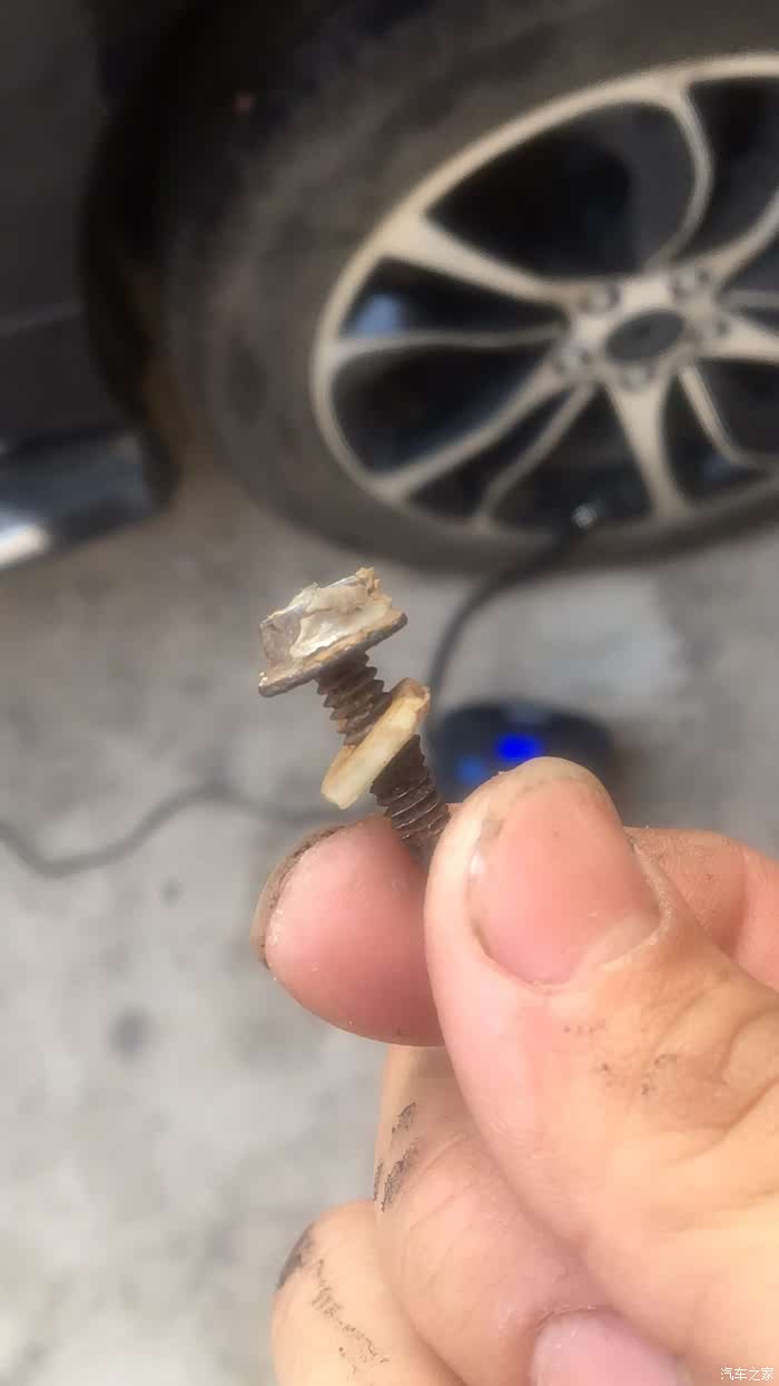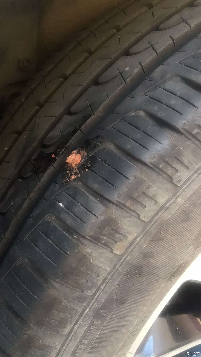 到了家门口,停下车来看了看,果然一颗螺丝钉扎进车胎里了。心疼啊