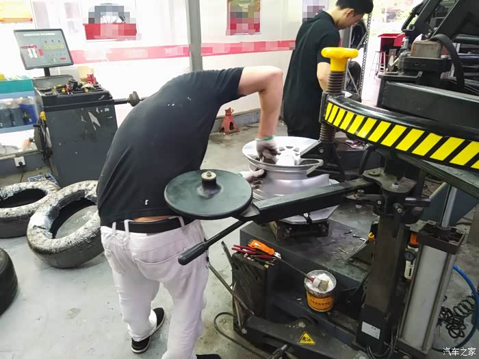 新轮胎往轮毂上套,没有专业设备是套不上的。