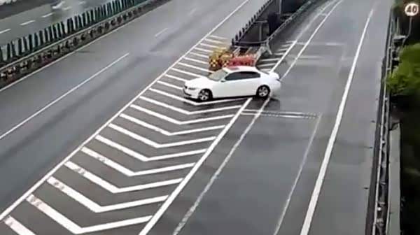 时间过去了大约十秒钟,大货车已经远去,而岔道上的轿车则越来越近。从轿车前面的双肾进气格栅判断,这是一辆货真价实的宝马轿车。是不是哪里不对呢?这辆宝马轿车这是在逆行,它要去哪里呢?果然,宝马开到岔道与主道的结合点时,司机迷糊了,没有方向感,前途一片迷茫,于是把宝马横在隔离区。