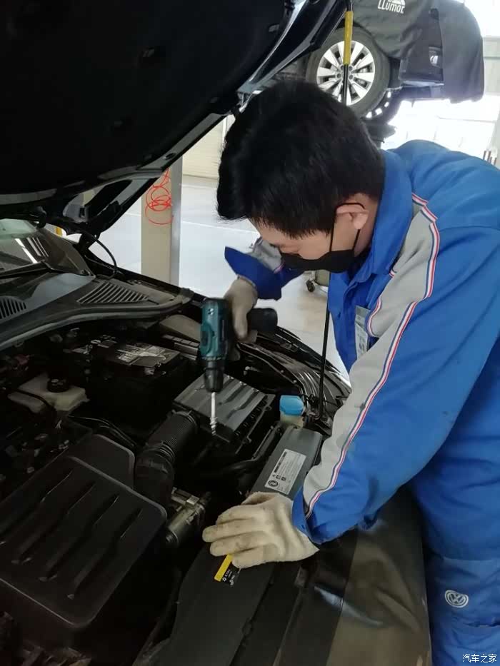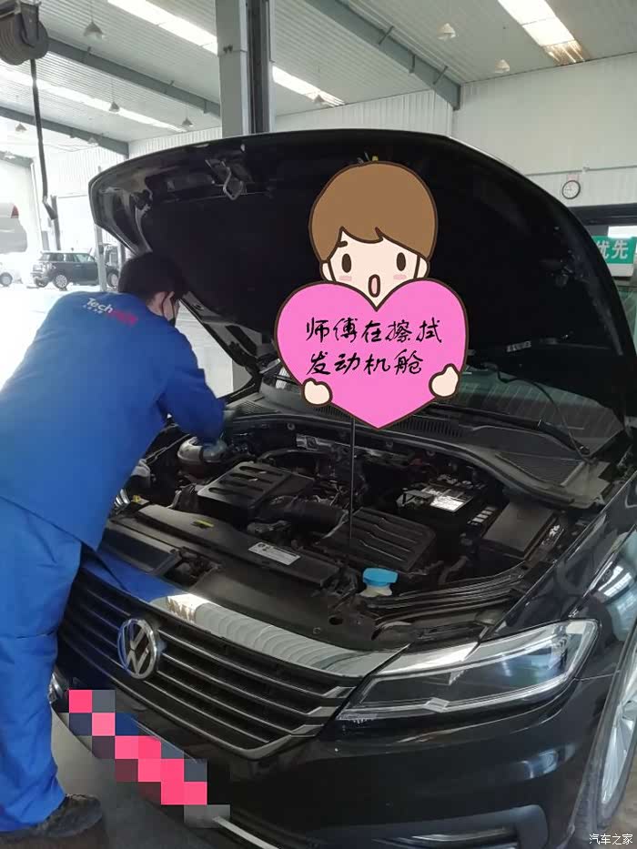 打开发动机舱盖,师傅做的第一件事情就是拿起抹布擦拭机舱内部件,这个动作暖心了。