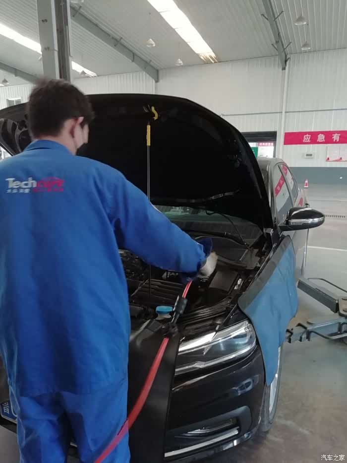 细心的师傅最后又检查刹车油、防冻液等液面正常情况,最后还又拿高压气吹了吹发动机舱。