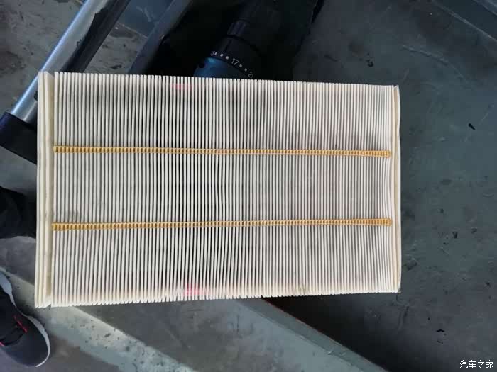 铺上防护布(我也不知叫啥名,自己给起了个),师傅拆开空气滤芯的盖子,拿出滤芯用高压气流吹干净,告诉我说滤芯吹干净再用,到下次保养时里程接近2万再换刚好,吹干净后复原装上。