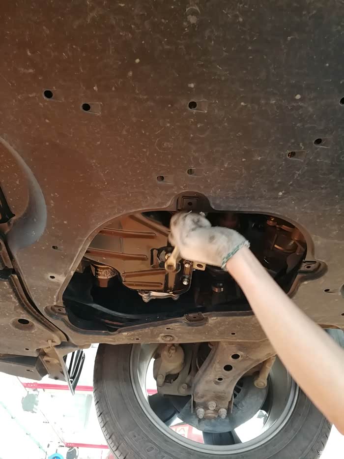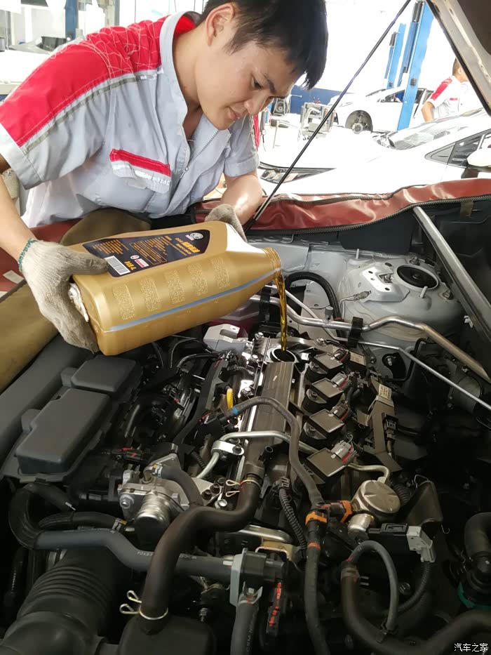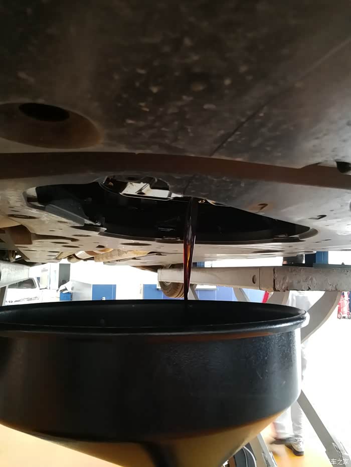 维修保养师傅开始放旧机油。由于才跑了五千多公里,旧机油看起来还晶莹透亮的,只是厂家规定的保养时间已到,只能更换了。