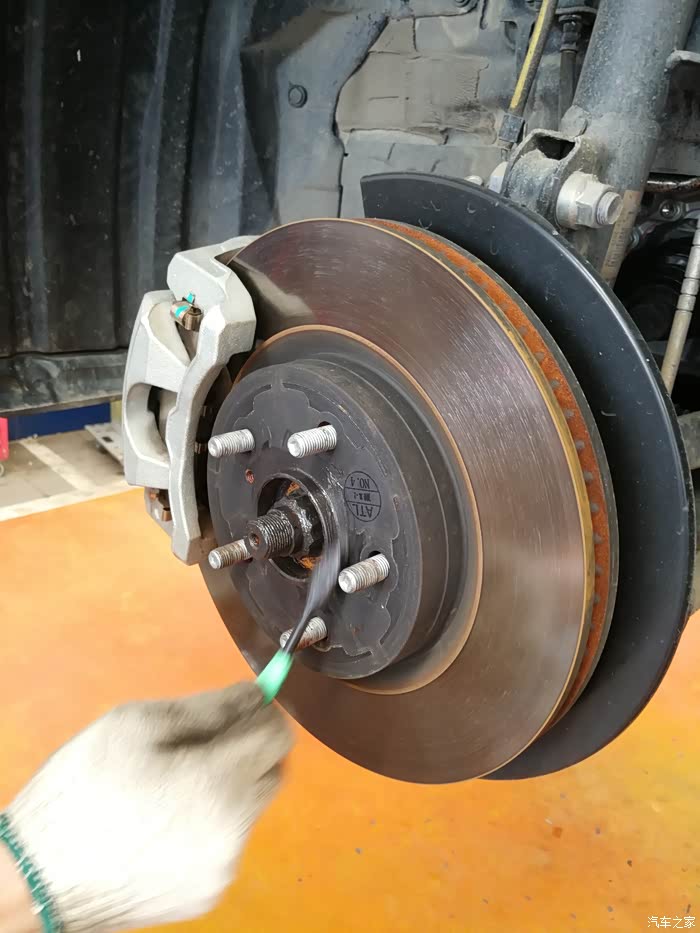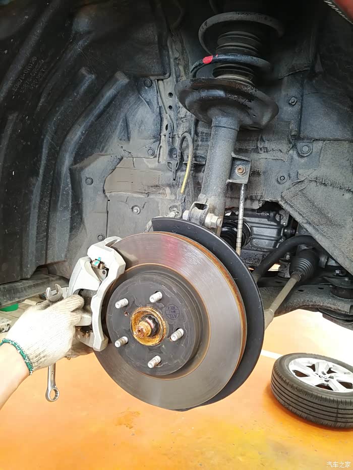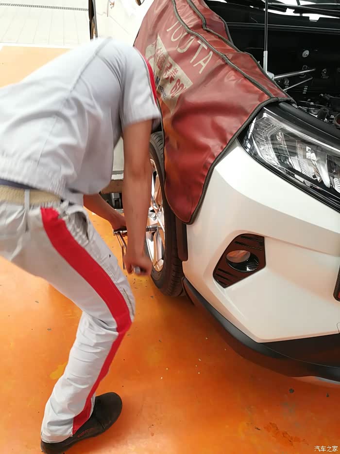 由于前右轮胎侧面有一处轻微刮痕,为了增加行车安全性,维修保养师傅建议四轮胎做前后交叉替换。开始拆下原车四个轮胎。