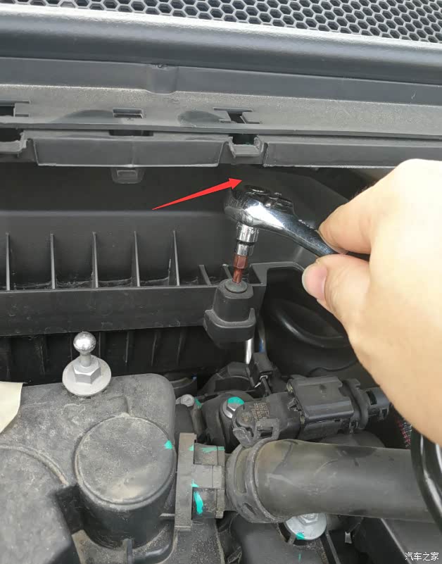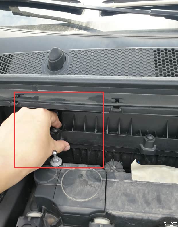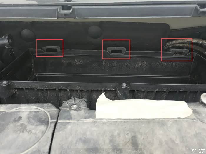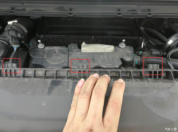 空气滤芯盒盖左侧有根管子,食指和拇指分别按住其左右两侧,然后直接往外拔就出来了,千万不要硬来,那样只会搞坏。