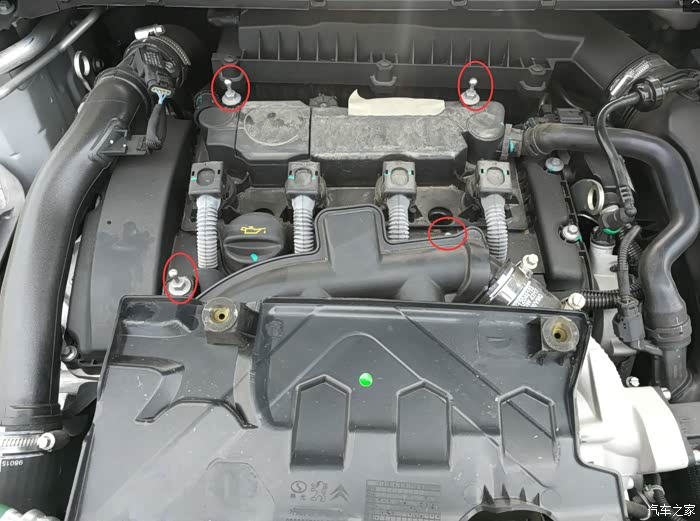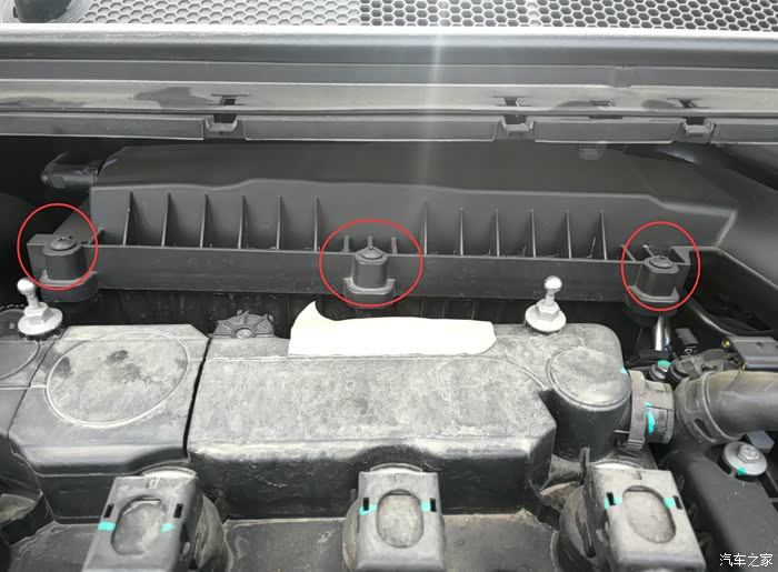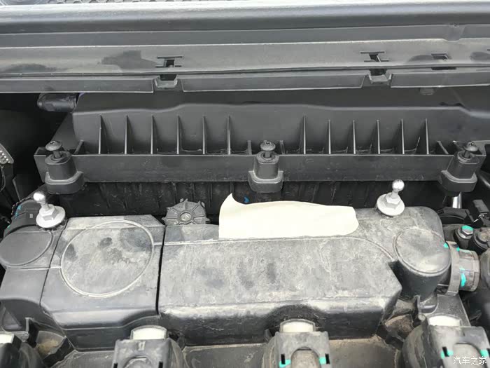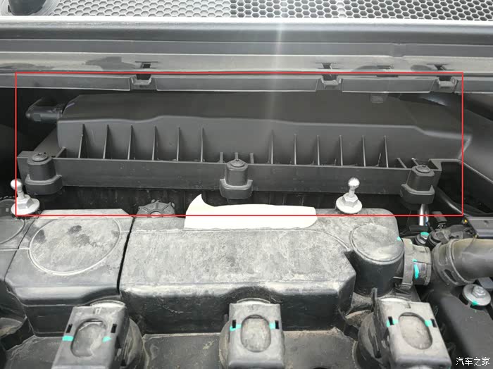 首先把发动机上门面的装饰盖板取下来,装饰盖板是卡在发动机四个柱子上面的,稍微用点力分别把装饰盖板从四个柱子上拔出来。