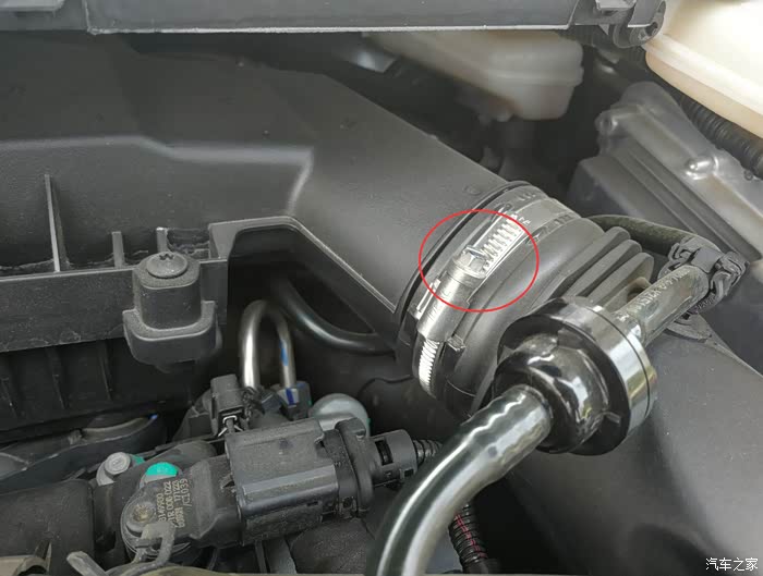 使用一字螺丝刀将发动机进气口卡箍拧松,能取出空气滤芯盒盖就行,不用全部把螺丝拧出来,拧太松卡箍容易掉落。