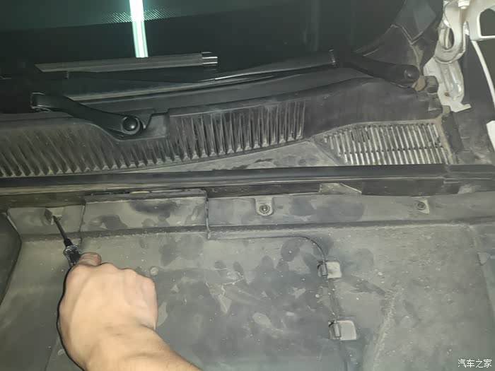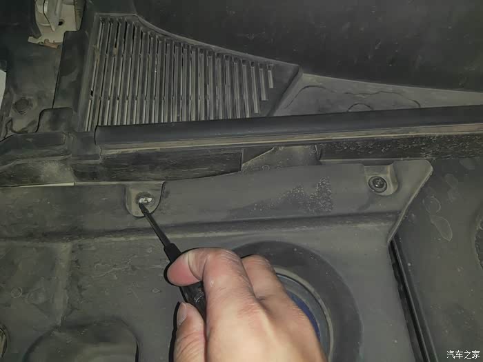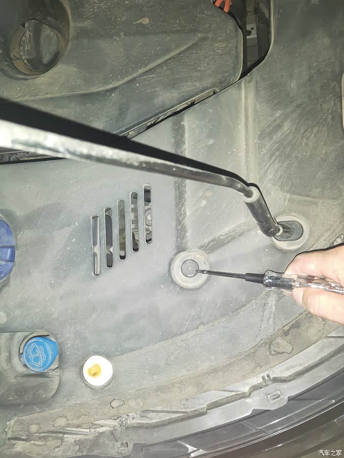 去掉下方这4个螺丝后,需要先把引擎盖支撑杆收起来然后才可以去掉护板。