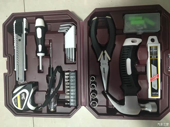 在奇瑞车主俱乐部积分商城兑换了一套工具箱,看上去还是很不错的,刚好这次换空气滤芯可以拿出来试试了!其实整个更换过程只需要一把十字螺丝刀和一个六角即可。