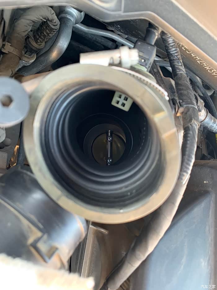 因为进气软管上面有些线束,还有进气压力传感器。拆完是这个样子