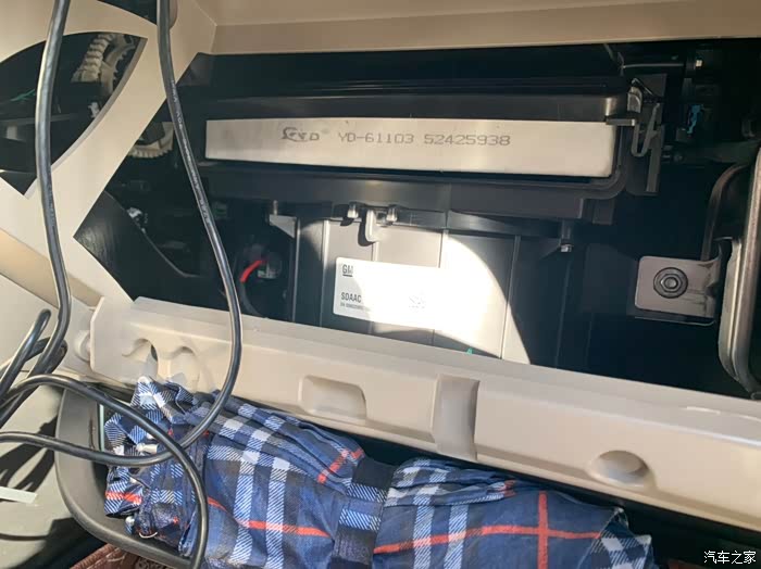 咱们先换车内空调滤芯,这个其实没难度也不需要工具,先打开扶手箱,拆下阻尼杆,右边黑的的,用手一拉就掉了,然后双手夹住扶手箱上部,用力往内测压一下,扶手箱就掉了,很简单。口诀就一个,大力出奇迹,车没那么容易坏。拆完是这个样子,