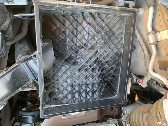 接下来就是拆,记住对角拆螺丝,要不然受力不均匀。拆完就能看见里面的空气滤芯了,把拆掉的螺丝保存好,最好别带在盖子上,防止掉进发动机舱,不好找!
