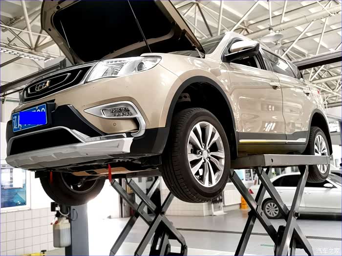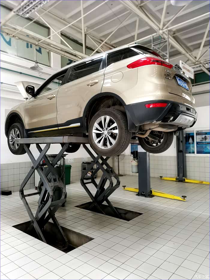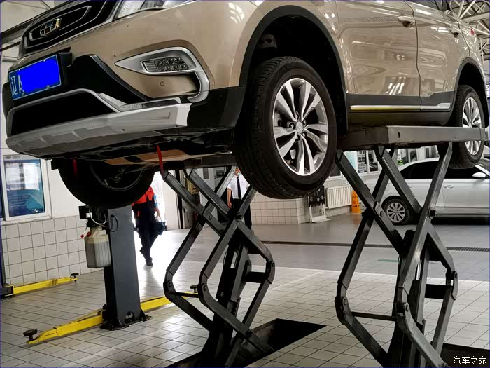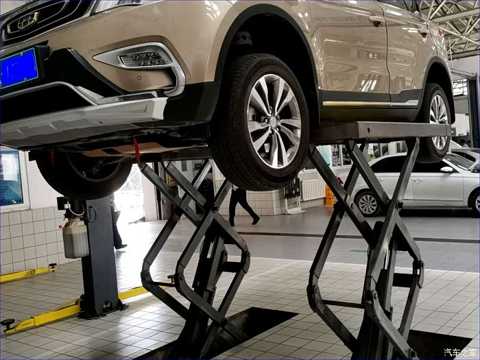 2、举起后,技师检查悬挂等车况。