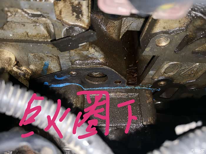 曲轴箱右侧,点火线圈下面这个位置,油很多,直接滴到下护板了 。