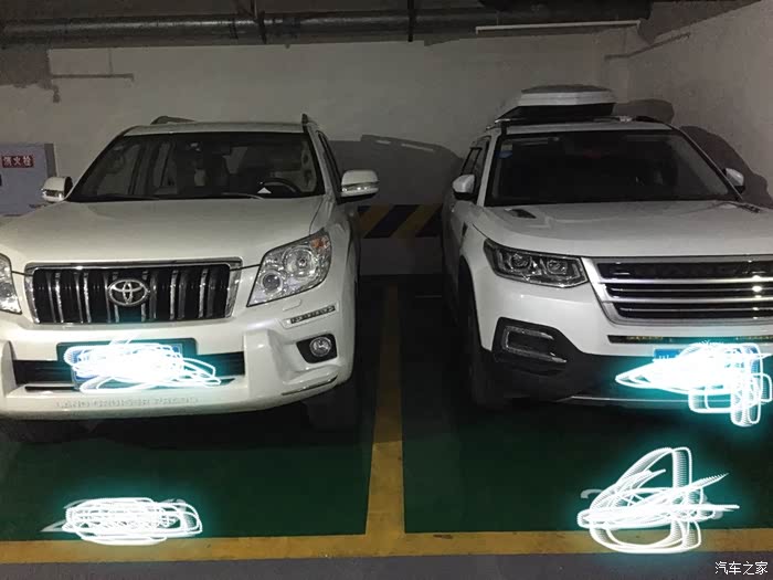 保养完开回停车场,停好车跟边上的普拉多来个对比,宽度感觉差不多但是高度就差多了。