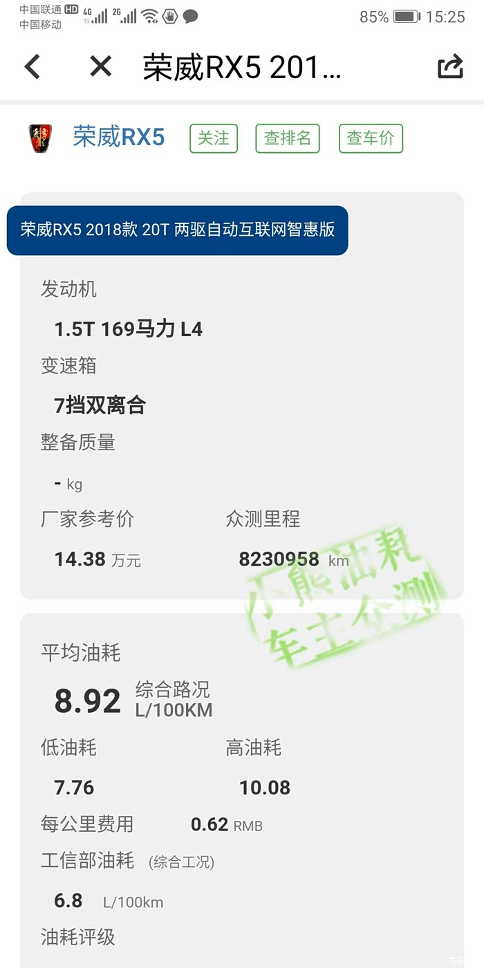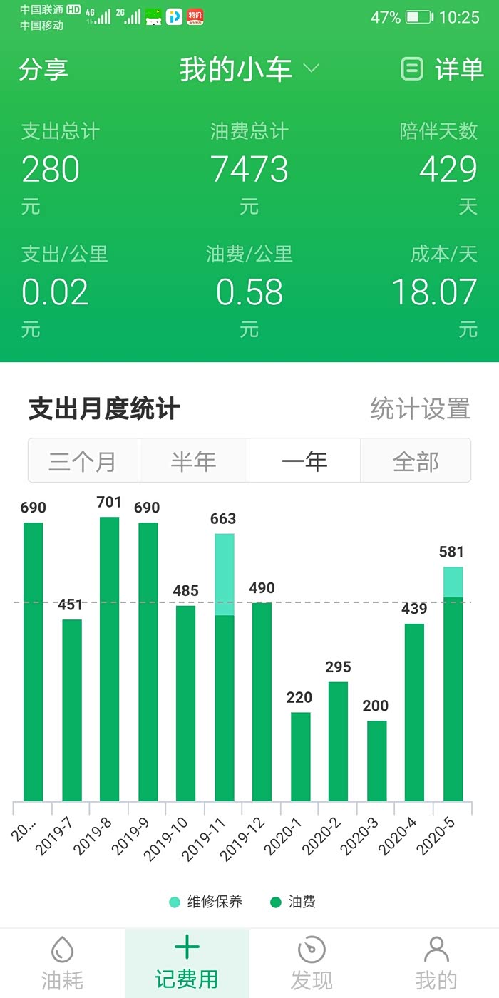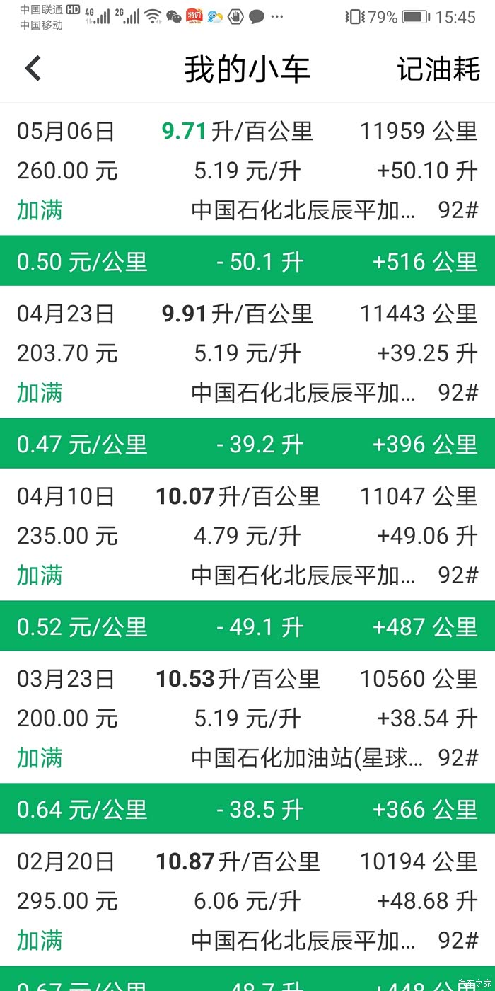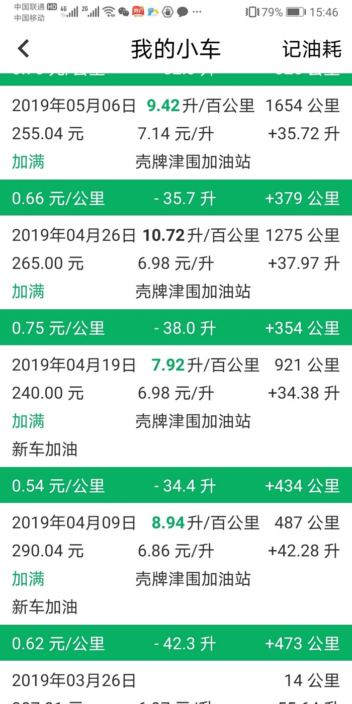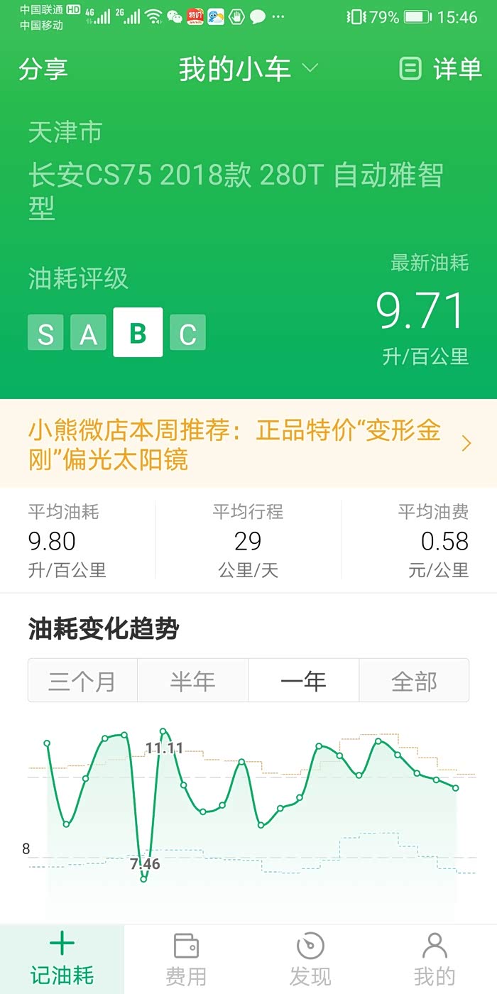 这是小熊一年的平均油耗9.8,和汽车之家计算有好方法一样,最低7.46升是上东戴河跑高速的油耗