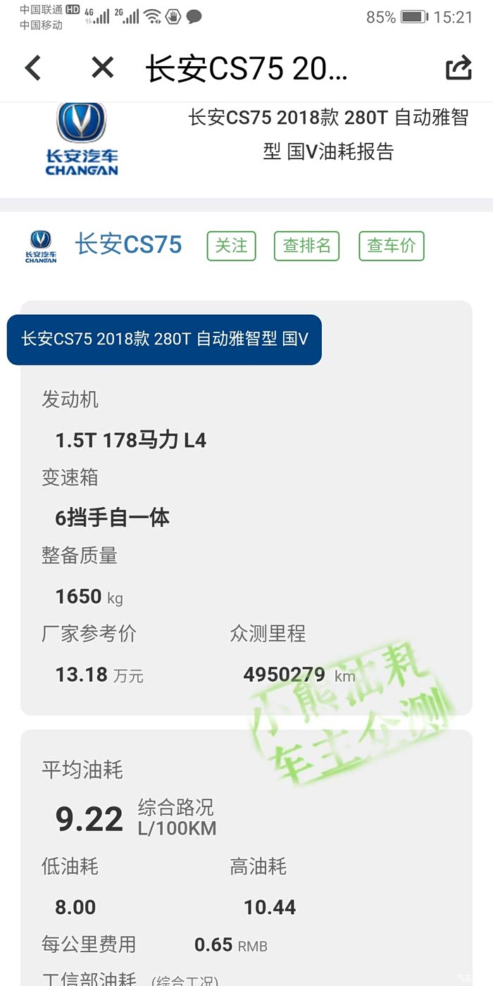 这次我坚决换SUV为了车高舒服,我先看的是荣威RX5差点买车,好来看网上说双离合顿挫就放弃了,也看过中华V7,江淮S5后因为做工不细致都被淘汰,因为2017款CS75机油增多延期考虑,最终选择了2018款长安CS75 ,刚选车时也看了车质网说75车容易生锈,帝豪就生锈害怕了,后来我看到儿子的13年CS35都7年了也没生锈我才下的决心 ,现在这车用一年了很好,油耗最重要的,小熊油耗软件9.8个平均29公里,在我预期不到一吨七的车,我想不抄10个就不算费油,车表上的油耗那叫欢乐,不计怠速和空调油耗表不准确,小熊油耗对别的同级别SUV车油耗差不多,1.5T的动力来的还是很猛比我之前的1.8的帝豪能强不差,车里的配置及装饰还是没有别的车可比,车门的重量和RX5,三菱欧蓝德重量不是一个级别,买车要看真实评价,油耗高低要看开车手法环境,高点低点不要过分纠结,国产车现在真的很好!