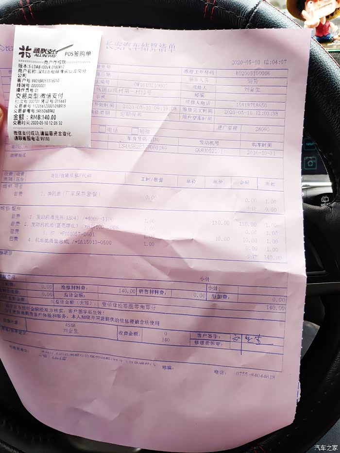 因为我买了保养套餐的,保养超划算的。拿到清单,交了款,回家了。因为是常规保养,所以较快,保养过程也请教了小哥哥一些疑问,小哥哥也细心回答,作业过程检查很细。