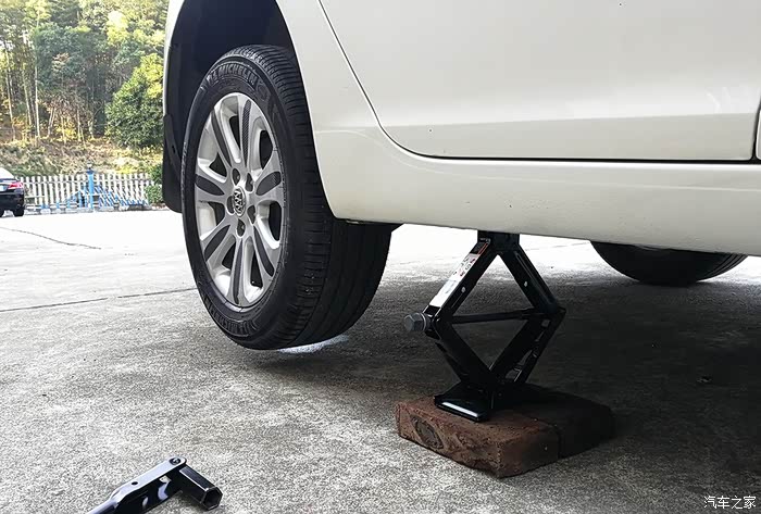 找两块砖垫着,把右后轮架起,垫砖是这样空间稍高一点好施工一点