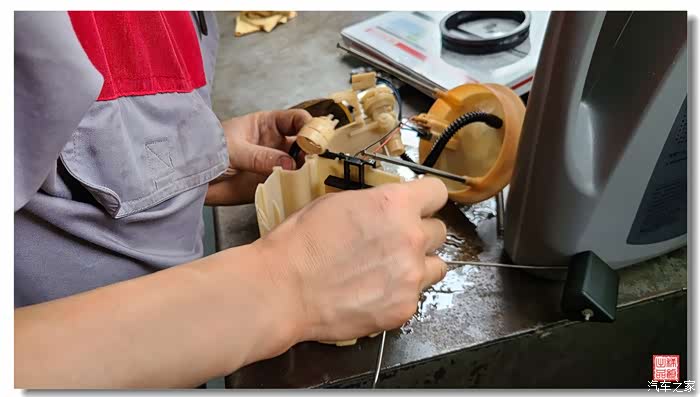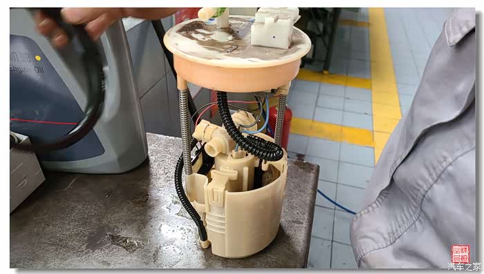 整个拿出汽油滤芯,值得注意的是两根波纹管千万不要拔出来,这个是一次性的,拔出来就不能装上去了,清洗滤芯和更换油泵都是不需要拆掉这两根波纹管的!