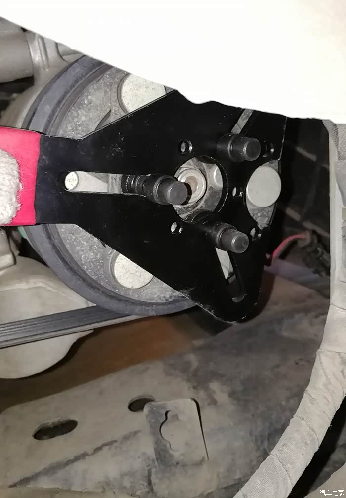 这个是拆离合器吸盘的,必须用他卡住吸盘才能把固定的螺丝拧下来,不然会一直跟着转开始以为用自己的棘轮扳手可以搞定,到要取皮带才发现空间极小,没有专用工具根本搞不定,只好停工临时买这个再加钱发了个次日达