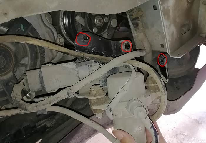 助力泵是通过这个支架的三个螺丝固定在车架上,好像都是10MM,这三个螺丝很不好取,主要是空间太狭窄