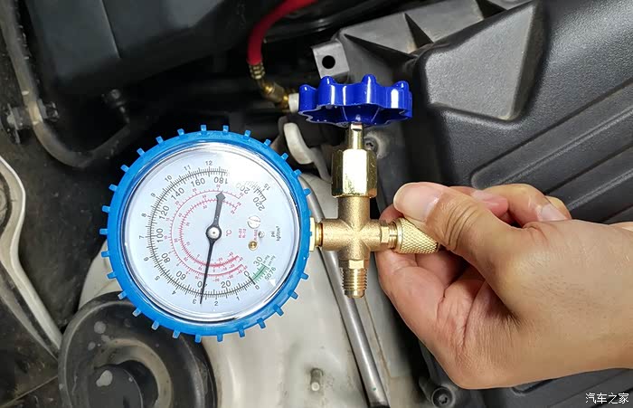 着车,风力最大,温度最低,大概四五分钟后,把低压口的盖子拧开,接上低压表的管道,检测压力正常,看来没有泄露暂时还不需要添加