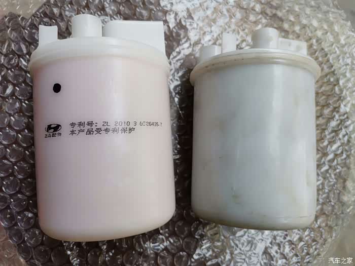 新的滤芯与拆下的旧滤芯对比,新的滤芯喷字遇到汽油会洗掉,大概正品就是这样吧。