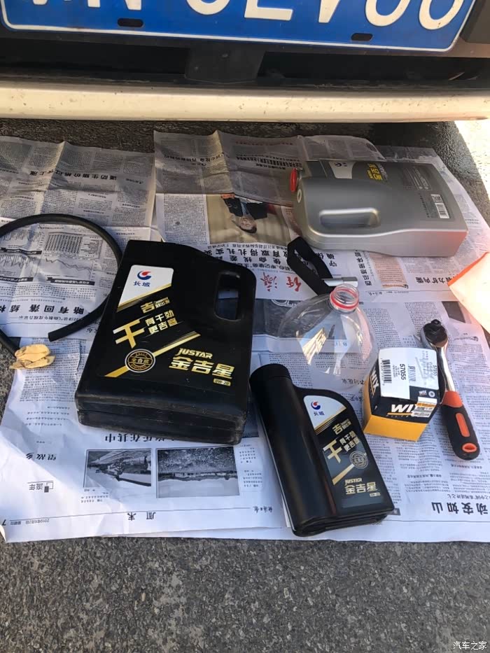 全家福,长城020便宜量又足,屯了20多升,可以用四次了,wix57055也是便宜又很好的,满足原厂泄压阀的压力要求,漏斗是农夫山泉桶利用,很合适,路过小店要了一个空桶接废机油,不能乱丢